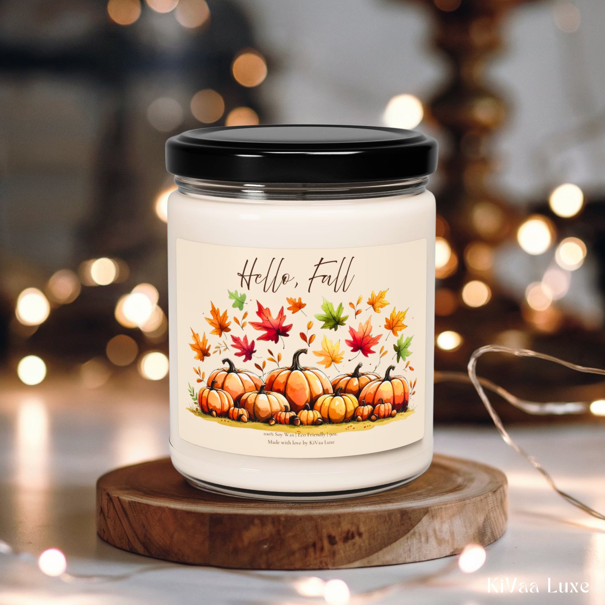 Celebrate the season with our Happy Fall Candle, featuring a cozy design of colorful pumpkins resting on a rustic field in a pumpkin patch, surrounded by autumn leaves in burnt orange, golden yellow, and muted green. This fall candle adds warmth and charm to your autumn décor, creating the perfect seasonal ambiance. Hand-poured with natural soy wax, it makes an ideal housewarming gift, hostess present, or cozy home accessory for any fall lover.