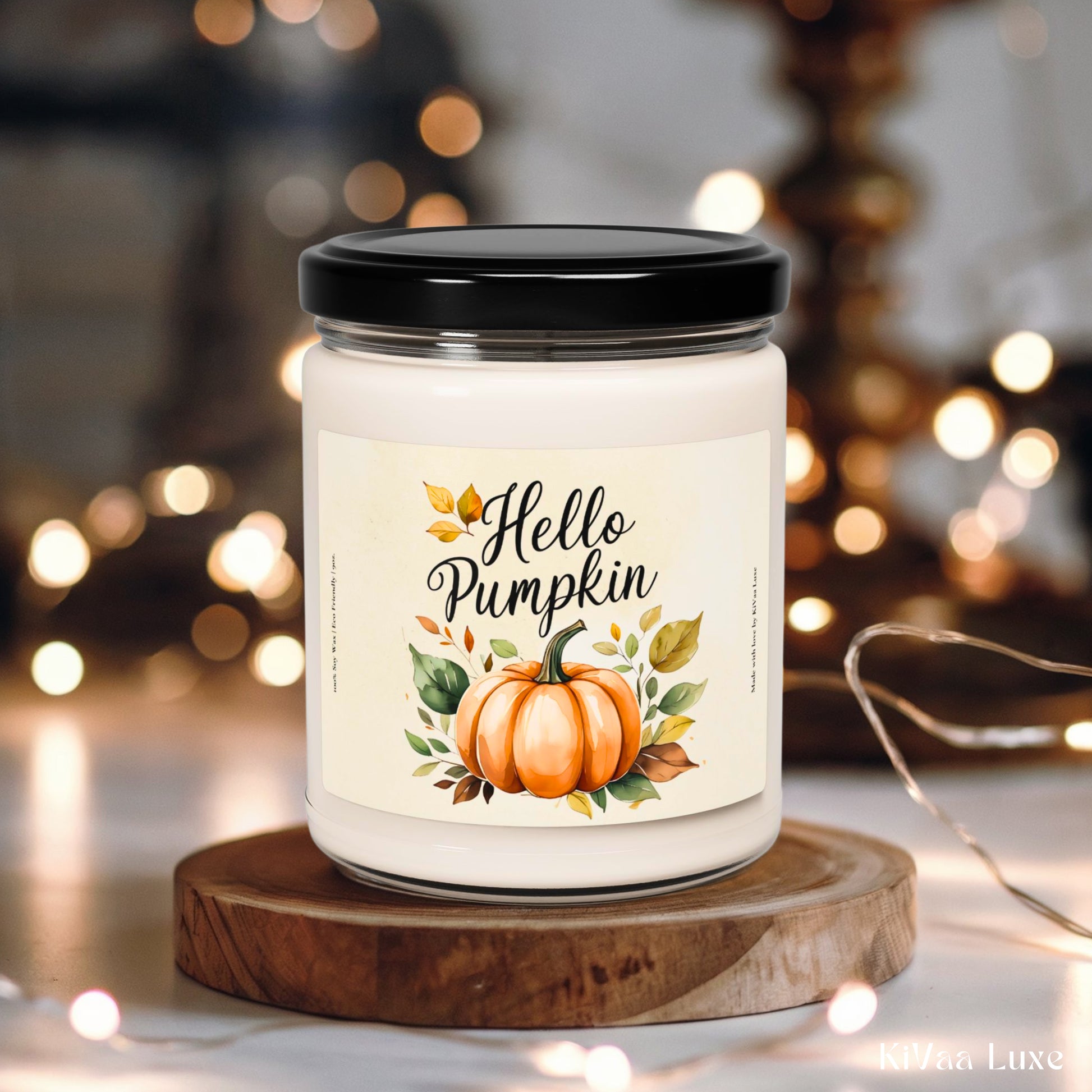 Celebrate the season with our Hello Pumpkin Candle, featuring a cozy design of watercolor design pumpkin resting on a rustic field in a pumpkin patch, surrounded by autumn leaves in burnt orange, golden yellow, and muted green. This fall candle adds warmth and charm to your autumn décor, creating the perfect seasonal ambiance.