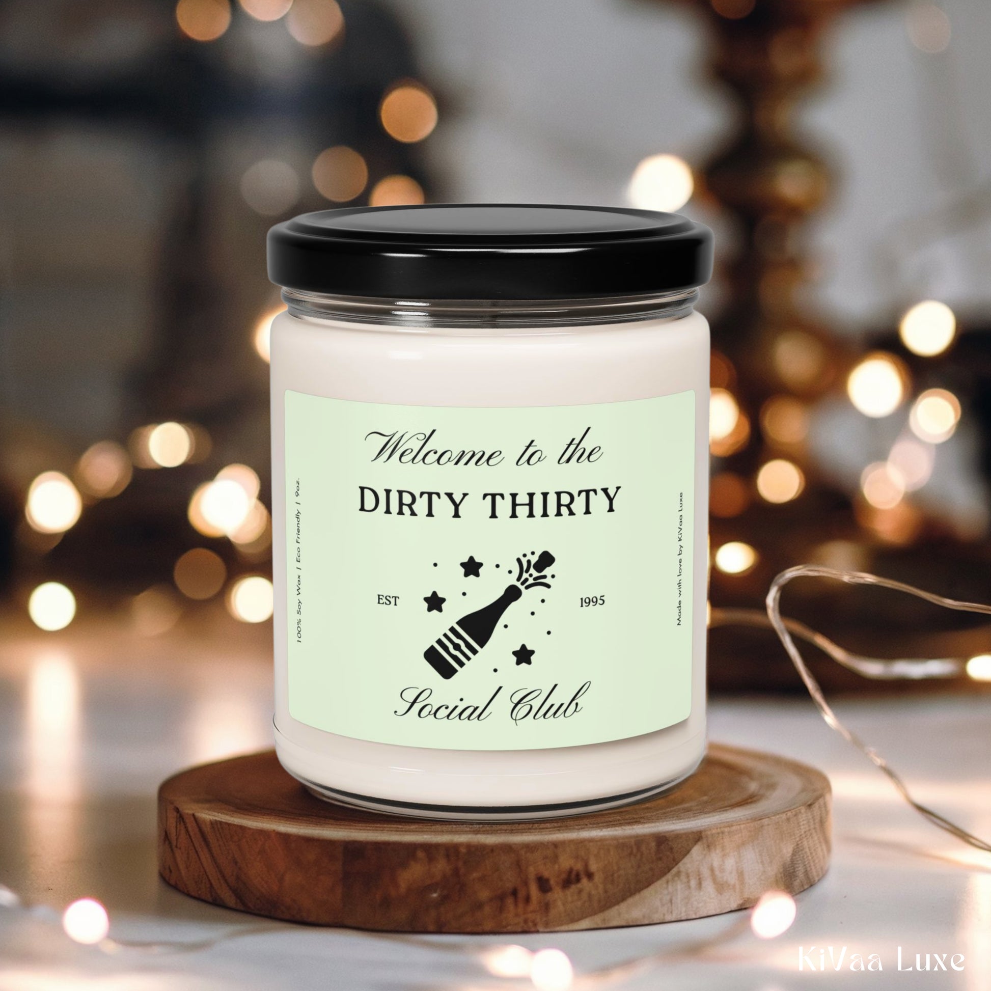 Pop the bubbly and light it up! Our "Welcome to Dirty Thirty Social Club" candle is the ultimate personalized 30th birthday gift candle for her, perfect for celebrating your BFF, sister, or best friend stepping into her thirtieth birthday. With a cheerful pastel lime cream label, a fun champagne bottle graphic, and an option to add a custom name or 1995 birth year, this 30th birthday gift is a playful nod to the bold and fabulous thirties era. Whether you're embracing your “in my thirties era”, marking the death to my twenties, or hunting for unique birthday gift ideas, this chic and sassy personalized candle is the perfect keepsake for any college grad, birthday queen, or glam grown-up. Great for gifts for 30th, gifts for her or him, and anyone turning 30 in style!