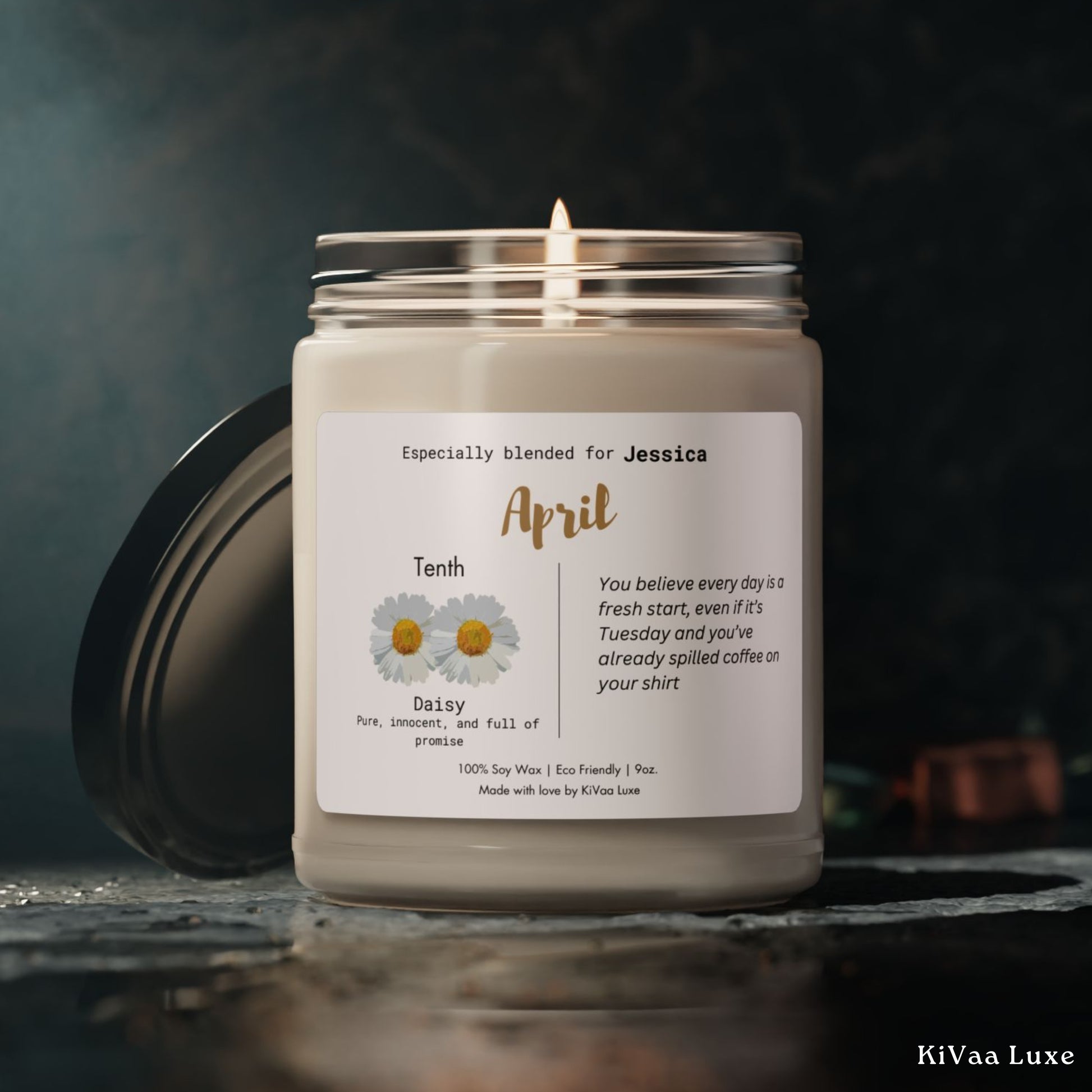 Celebrate an April birthday with this Personalized Birth Flower Candle, a perfect Birth Month Gift for someone special! This Scented Soy Candle is customized with the recipient’s name, birthdate, and their birth flower, along with a message that reflects the strong and passionate nature of April-born individuals. This Birthday Candle is a thoughtful and unique gift for any milestone—18th, 21st, 25th, 30th, 35th, 40th, 45th, 50th—or simply to celebrate a loved one. Whether you’re searching for an April candle, April bday gift, birthflower gift, or personalized candle, this makes a perfect keepsake for gifts for her & him!