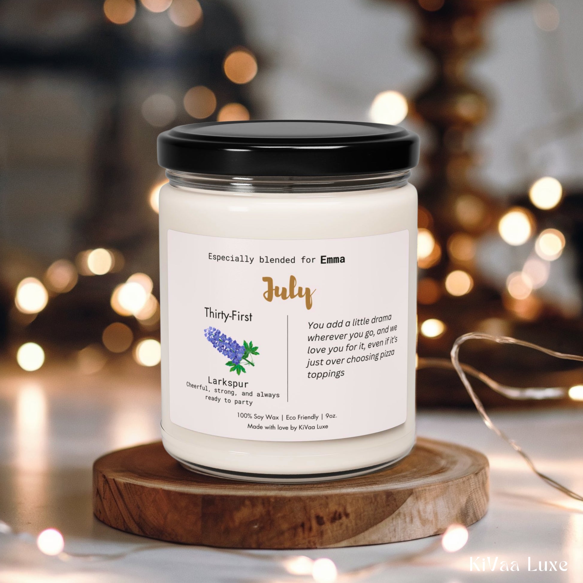 Celebrate a July birthday with this Personalized Birth Flower Candle, a perfect Birth Month Gift for someone special! This Scented Soy Candle is customized with the recipient’s name, birthdate, and their birth flower, along with a message that reflects the confident and caring nature of July-born individuals. This Birthday Candle is a thoughtful and unique gift for any milestone. Whether you’re searching for a July candle, July bday gift, birthflower gift, or personalized candle, this makes a perfect keepsake for gifts for her & him!