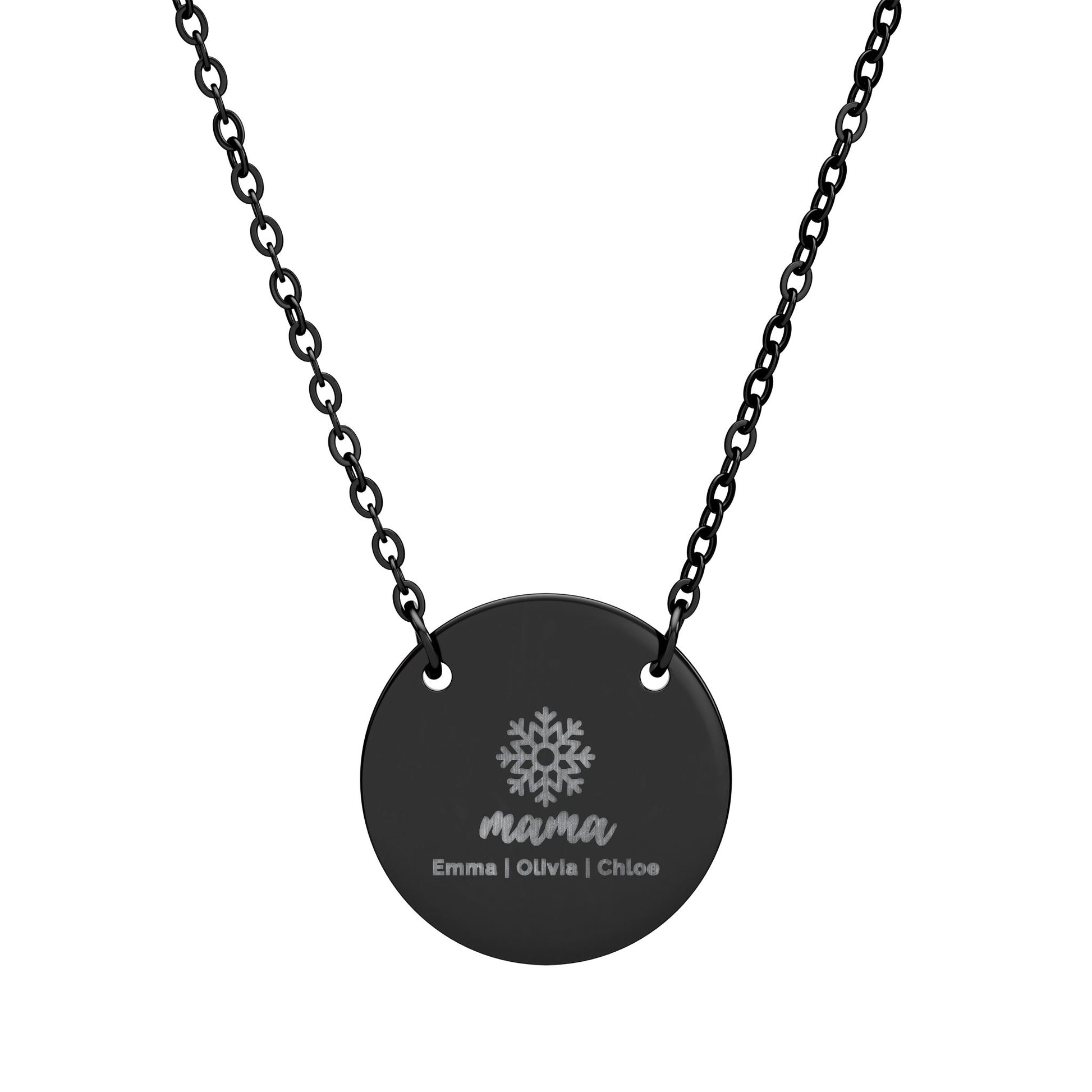 Celebrate the magic of the season with this beautiful engraved round pendant necklace, featuring a minimal snowflake icon and the word “mama” in a bold, elegant script. Each piece is personalized with names of the recipient's kids and engraved with precision, creating a timeless keepsake she can treasure long after the holidays are over.